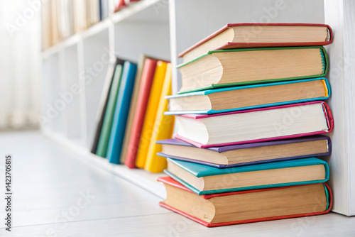 book, stack, colourful, shelf, reading, library, literature, education, learning, cognition, paper, spine, vibrant, arrangement, stacked, storage, cover, study, vertical, organised, display, classroom, academic, text, collection, school, bookshelf, printed, subject, hardcover