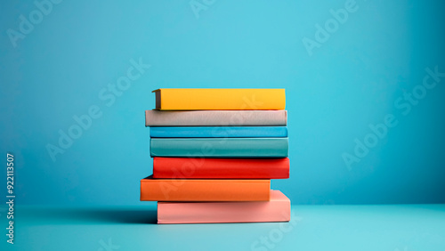 Stack of Colorful Books on Blue Background. Book Lover's Collection, Literary Treasures, Bookish Charm.