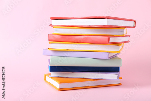 Stack of colorful books on pink background