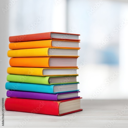 Stack of colorful books on wooden surface