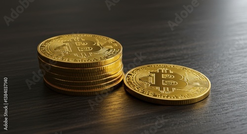 Stack of Gold Bit coin Cryptocurrency Coins on Dark Wooden Surface – Digital Currency Concept
