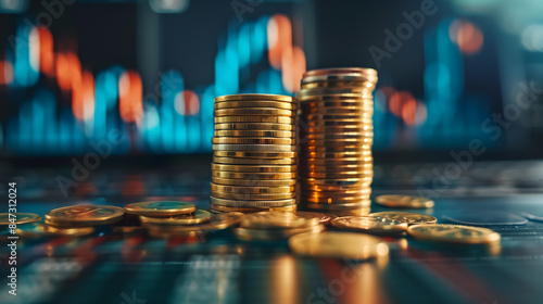 Stack of gold coins with trading charts on the background as a symbol of stock trading or investment
