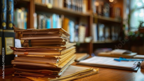 Stack of old folders in archive image copy space. Past time documents collected in library banner background blurred. Information materials storage concept photography copyspace