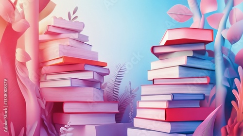 book, reading, education, cognition, learning, stack, literature, library, study, school, pastel, foliage, decorative, stylised, pink, blue, background, creative, concept, design, illustration, art, academic, book, hardcover, page, textbook, pile, arrangement, story, novel, wisdom, information, open, close, cover, spine, leaf, plant, floral, botany, fairy tale