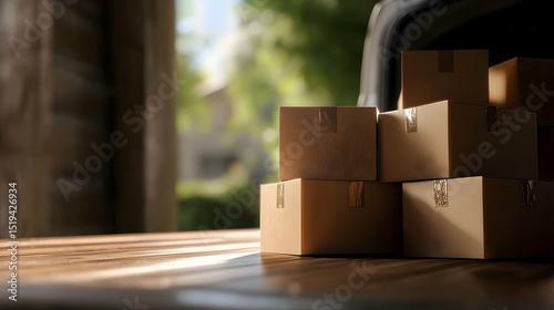 box, cardboard, package, shipping, delivery, stacked, brown, wooden, table, light, sunlight, nature, blurry, background, cargo, transport, logistic, transportation, moving, business, commerce, good, product, industry, parcel, shipment, storage, inventory, warehouse, cardboard box