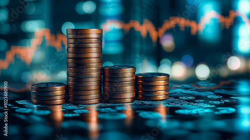 Stacked coins on a background of graphs and statistics. Concept of finance, inflation and world economy