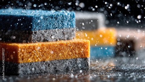 sponge, square, stacked, colourful, wet, water, droplet, textured, closeup, moist, dark, background, blue, orange, grey, material, many-coloured, absorbent, porous, abstract, detail, macro, geometric, three, layer, modern, still, life, composition, sharpened, shallow, depth, splash, creative, product, display, industrial, pattern, kitchen, cleaning, hygiene