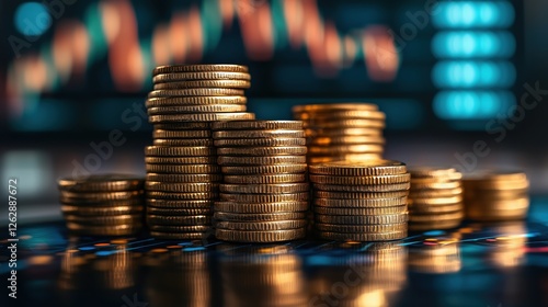 Stacked Gold Coins on Display Against a Blurred Financial Chart, Symbolizing Wealth, Investment, and Economic Growth in a Modern Business Environment