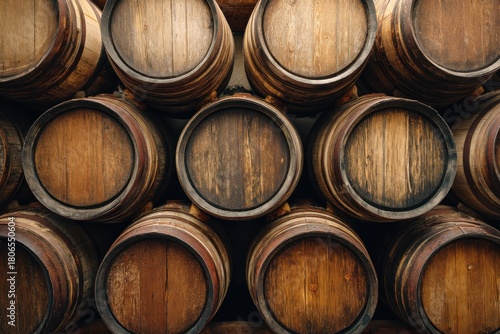 Stacked wooden barrels background