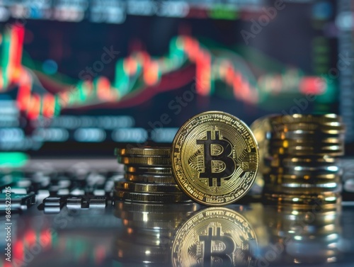 Stacks of Bitcoin coins are placed on a financial chart, symbolizing cryptocurrency trading and market analysis.