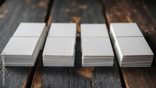 Stacks of blank business cards on a wooden surface arranged neatly in four piles.