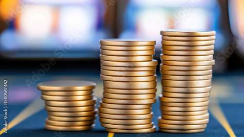 Stacks of Casino Chips on Gambling Table Close-up image of golden casino chips stacked in various heights on a colorful table, symbolizing betting and gambling wins