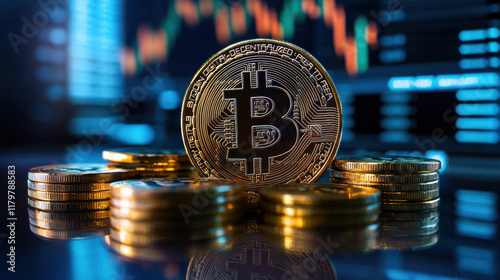 Stacks of gold bitcoins symbolize cryptocurrency investment and growth