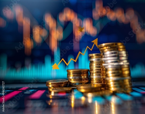 Stacks of gold coins against a financial graph with upward trends, representing investment growth.