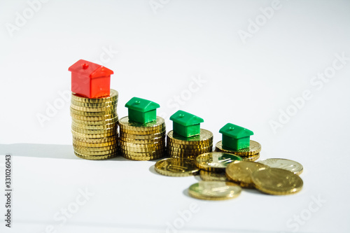 stacks of gold coins and red and green houses