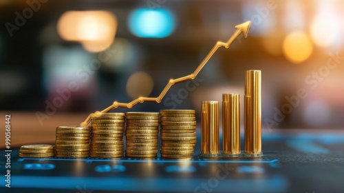 Stacks of gold coins forming bar charts, symbolizing rising GDP,