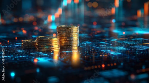 stack, gold, coin, sleek, holographic, financial, document, futuristic, hologram, projection, money, artificial, innovation, intelligence, concept, finance, investment, model, market, visualisation, datum, integration, render, technology, digitization, display, virtual, currency