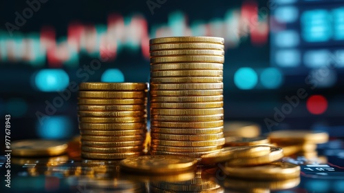 Stacks of gold coins with a background of financial trading graphs