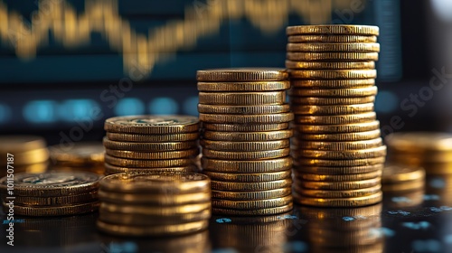stacks of gold coins with rising stock chart in the background symbolize the increasing price of gold