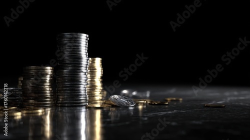 Stacks of shiny coins with golden and silver tones against a dark background, creating a dramatic and elegant financial scene for investment themes