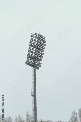 Stadium floodlight with metal pole, lighting mast, tower with floodlights in the sports stadium against the white sky.