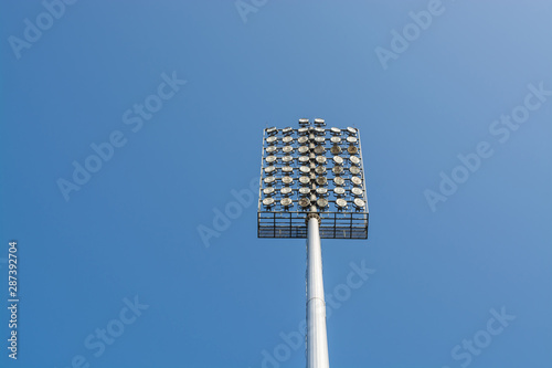 pole, light, background, spotlight, blue, sky, bright, power, lamp, halogen, tower, white, metal, equipment, field, energy, high, shine, street, electric, electricity, tall, illuminated, football
