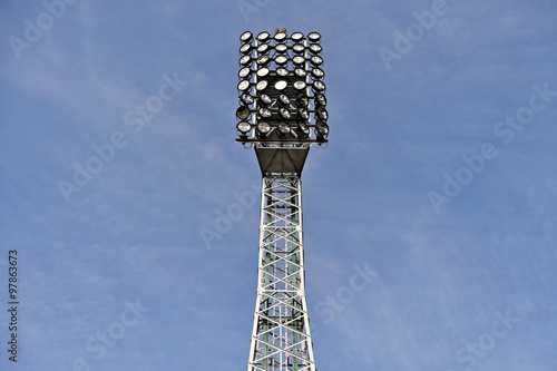 background, beam, big, bright, bulb, construction, day, daylight, electric, electricity, energy, equipment, field, floodlight, football, game, high, horizontal, illuminated, illumination, isolated, lamp, light, metal, object, pole, power, reflector, sky, sport, spot, spotlight, stadium, tower