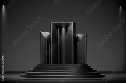 Stage podium scene for Award celebration or product presentation on black background with lighting, generative ai.