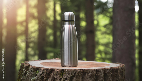 Stainless steel water bottle on tree stump. Thermal container for hot drink. Beverage holder.
