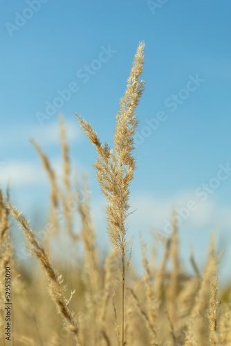 stalks of dry grass in a field on the background of the sky. grass in wind