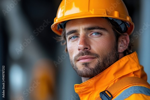 Standing construction worker photo, wearing a hard hat and uniform,