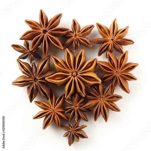 Star anise brown whole pods tightly packed in perfect heart formation Spices food and culinary isolated on white background