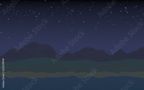 Starry moonless sky. Ocean shore line with waves on a beach. Island beach paradise with waves. Vacation, summer, relaxation. Seascape, seashore. Minimalist landscape, primitivism. 3D illustration