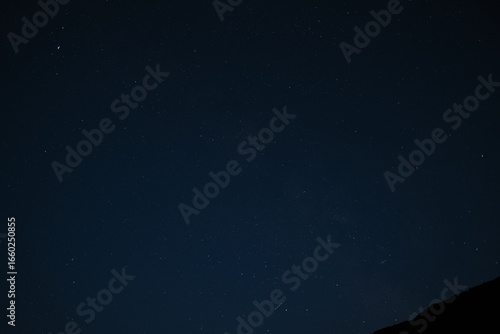 Starry night sky above mountain silhouette, with faint meteors and constellations visible in deep blue. View of the Milky Way from the northern hemisphere.