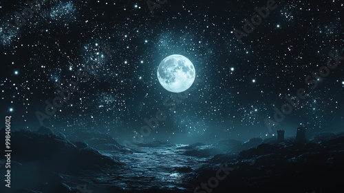 Stars and the Moon: Create a scene of the moon surrounded by stars, with the moonlight and starlight illuminating the night.