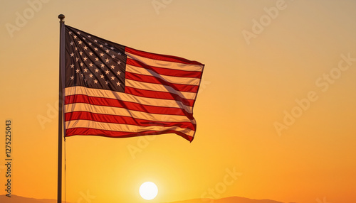 Star-spangled flag waving against warm sunset, celebrating freedom