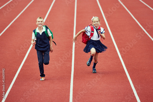 Start. Back to school, kids and education concept. Girl and boy dressed in school uniform as elementary student carrying big backpack running on treadmill at the stadium or arena.