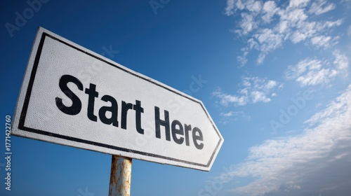 Start Here Arrow. Directional Road Signpost in Sky Background