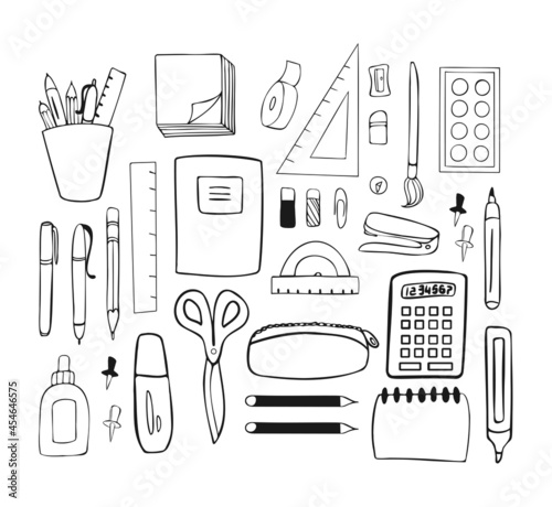 Stationery doodle set. Office accessories in hand drawn style. Vector illustration on isolated background.