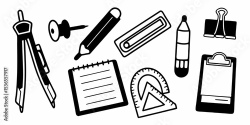 stationery, sketching, tool, design, vector, illustration, compass, thumbtack, crayons, eraser, notebook, ruler, marker, clipboard, drawing, art, office, supply, school, education, creative, set, graphic, doodle, collection, outline, black, white, icon, office supply, school supplies, sketchbook, artistic, clip art, design element