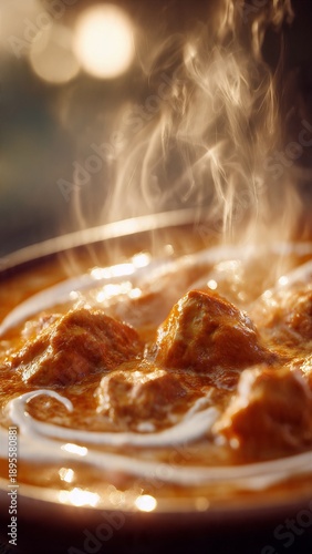 Steaming bowl of rich, creamy tomato curry with golden meatballs (or paneer dumplings) and a swirl of cream, bathed in warm, golden light.