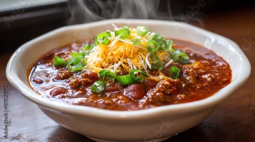 Steaming bowl of Texan beef chili with kidney beans topped with shredded cheese and green onions