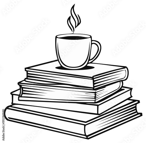 hot drink, cup, drink, beverage, hot, steam, stack, book, literature, reading, education, cognition, study, library, bookshop, learn, novel, textbook, story, author, writer, publication, paperback, hardback, cover, page, chapter, information, collection, classic, story, creative, monochrome, black-and-white, line art, illustration, design, graphic, isolated, art, drawing, vector, outline, symbol