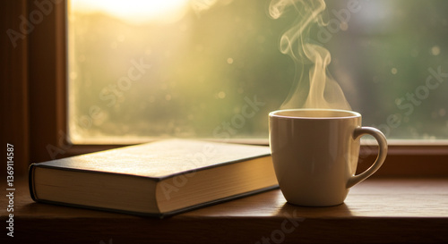 Steaming Coffee Mug with Book on Windowsill Morning Sunlight Reading Time