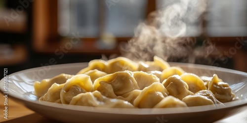 Steaming hot dumplings served on white plate in cozy kitchen