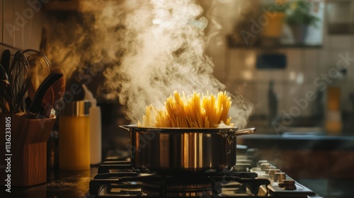 pasta, steaming, cooking, kitchen, pot, food, meal, dinner, lunch, boiling, water, heat, stove, gas, burner, steam, hot, delicious, tasty, deliciously, italian, cookery, noodle, spaghetti, fettuccine, linguine, penne, macaroni, comfort, home, warmth, appetising, culinary, preparation, process, texture, colours, gold, yellow, light, shadow, background, domestic