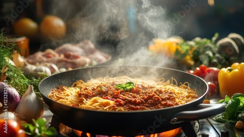 pasta, food, cooking, sauce, spaghetti, meat, hot, steam, meal, dish, kitchen, dinner, lunch, ingredient, tomatoes, basil, garlic, pepper, vegetable, fresh, delicious, cookery, preparation, frying, pan, stove, flames, fire, plate, eatery, cook, receipe, homemade, culinary, epicure, healthy, eat, nourishment, tasty, closeup, background, table, produce, diet, brown, orange, yellow, red, green