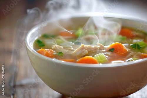 Steaming vegetable soup in a white bowl. Healthy food concept with copy space.