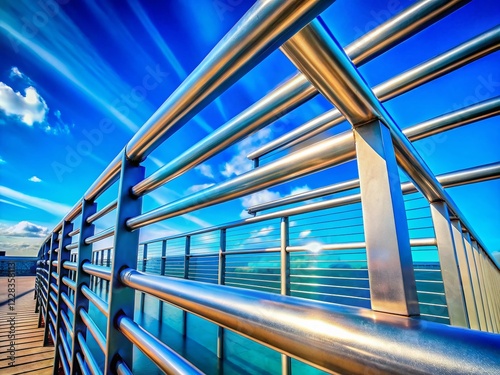 railing, architecture, blue skies, building, modern architecture, exterior, design, urban, city landscape, structure, metal, sky, construction, industrial, geometric, line, texture, detail, perspective, photo, building exterior, modern building, steel, balustrade, fence, metalwork, stainless steel, view, city landscape, city, skyscraper, horizon, elevation, building design, facades, industrial design