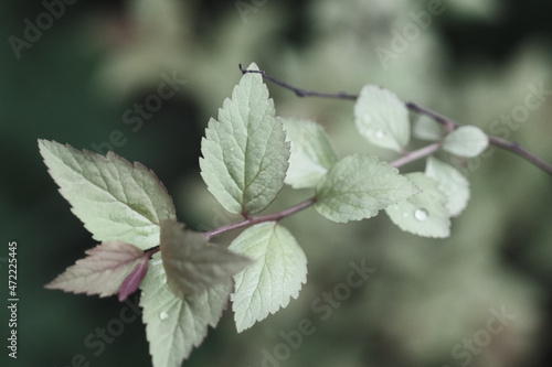 stem with fresh wet violet and green leaves with bokeh in the spring garden